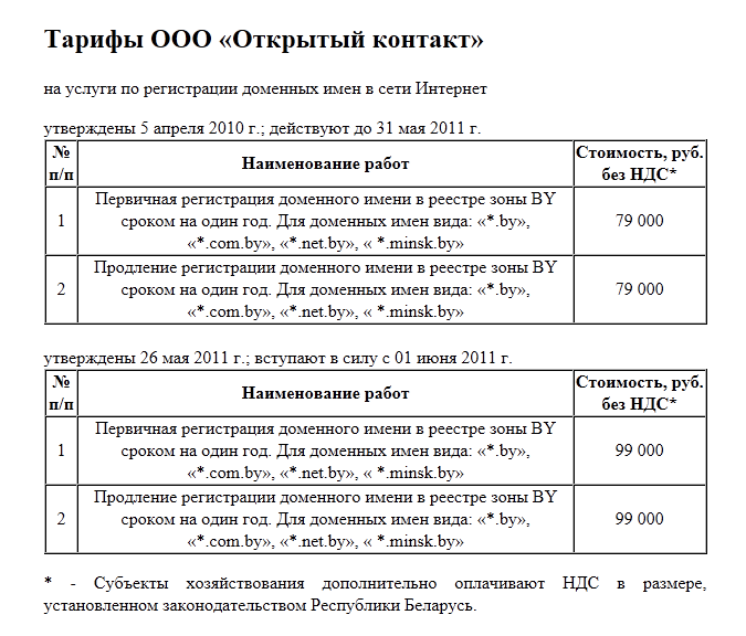По наводке @flickerblog. На tld.by размещен публичный договор с обновленными ценами на домены .by. С 1 июня новый тариф — 99 тысяч за годовую регистрацию или за продление на год. Вообще недавний тендер на обслуживание доменной зоны .by выиграл TUT.by, однако пока в официальные права не вступил. Рассказывая про эту победу на конференции «Креативный марафон», Юрий Зиссер сказал, что «мы просто предложили самую низкую цену». И ожидалось, что регистрация подешевеет. Но видим, что даже у исконно белорусской зоны, судя по всему, есть зарубежные (валютные) составляющие в себестоимости. Потребляем по новым ценам.