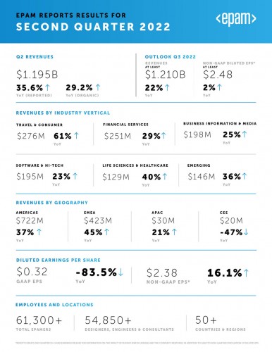 Общая численность персонала составляла примерно 61 300 человек по состоянию на 30 июня 2022 года. EPAM ожидает в третьем квартале, что выручка составит не менее 1,210 млрд долларов.